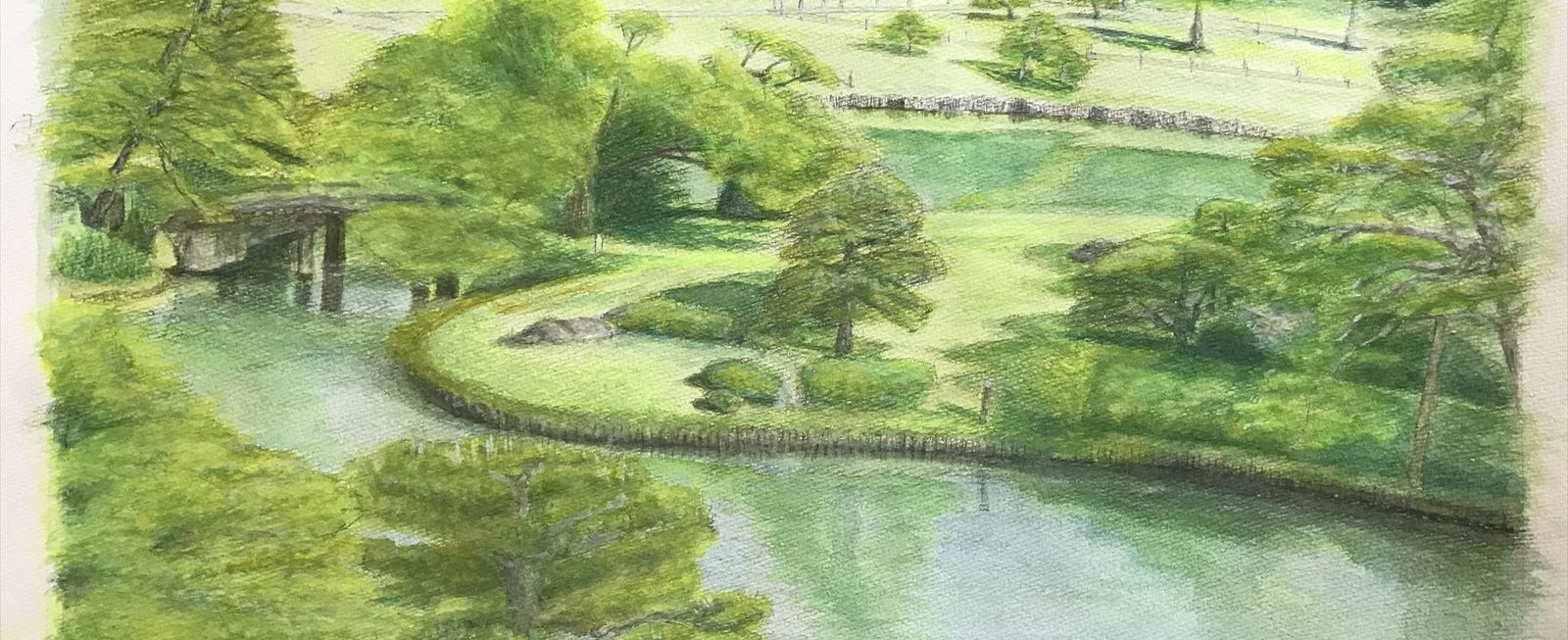 六義園を描く水彩画50作目|5月の新緑に包まれた特別名勝の風景と歴史を辿る【F10・文京区】